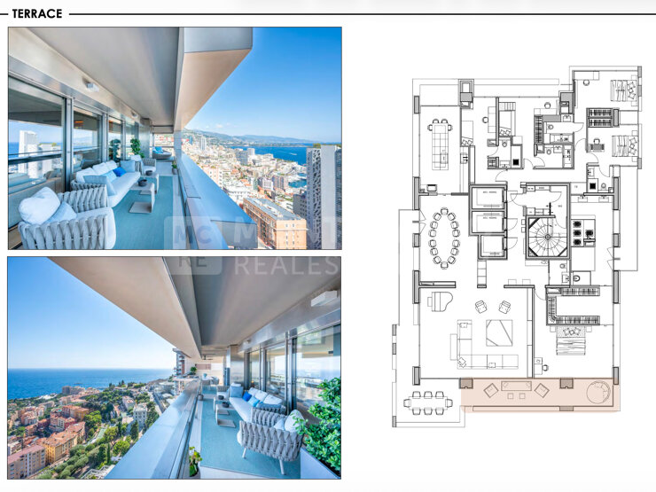 L'appartamento dispone di un ampio soggiorno con il soggiorno che si apre su una grande terrazza, offrendo una vista panoramica mozzafiato sul Principato, sul Palazzo del Principe e sull'infinito blu del Mar Mediterraneo.