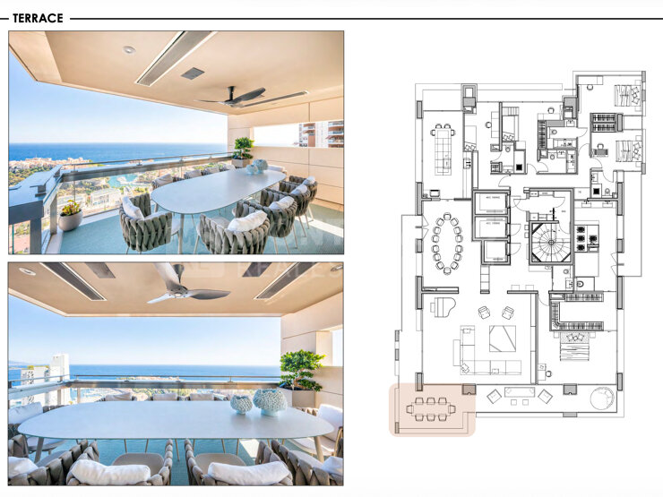 L'appartamento ha 5 camere da letto, ognuna con il proprio bagno privato. La camera da letto principale si apre su una grande terrazza e include un home cinema, un camerino doppio e una spa con jacuzzi.