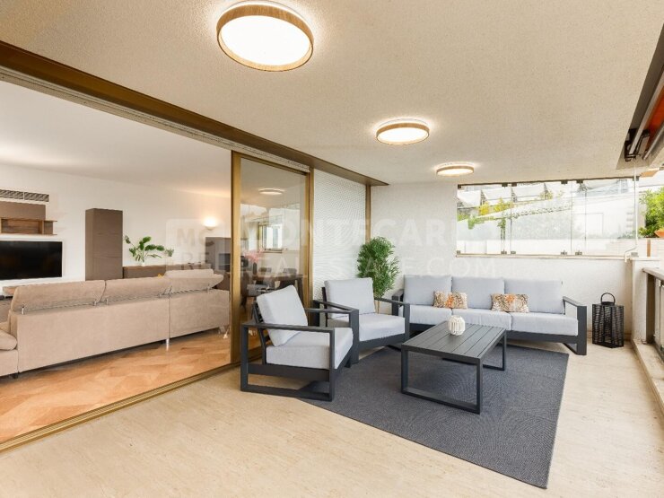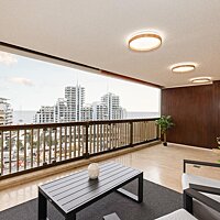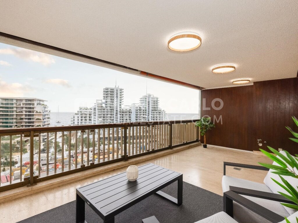 Questo splendido appartamento è composto da un bel ingresso, un ampio soggiorno che si affaccia su una terrazza con vista mare, una cucina attrezzata, due camere da letto e due bagni.