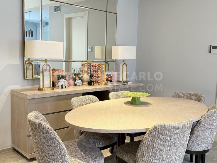 L’appartamento è composto da un ampio soggiorno con una moderna cucina a vista completamente integrata. Le tre camere da letto, ciascuna con il proprio bagno en suite, garantiscono il massimo comfort. Un balcone che percorre l’intera lunghezza dell’appartamento dona luminosità e un’apertura piacevole verso l’esterno.