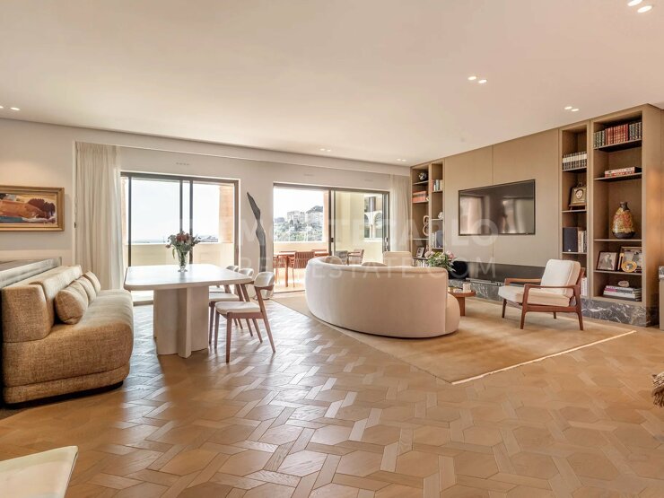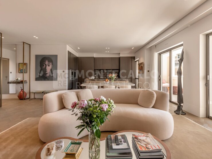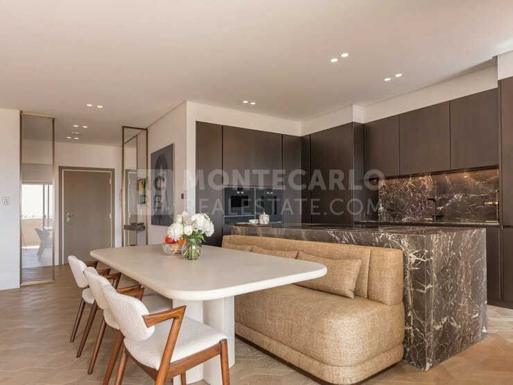 L’appartamento è composto da un ampio ingresso che conduce a un doppio soggiorno con cucina a vista completamente attrezzata, una camera padronale con bagno en suite, una cabina armadio e uno studio, due ulteriori camere en suite con bagni con doccia, un bagno per gli ospiti, nonché una profonda terrazza con una vista spettacolare sul porto di Cap-d’Ail.