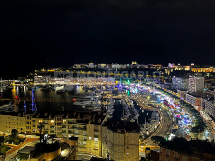 Un doppio soggiorno e sala da pranzo che si apre su una terrazza con vista mozzafiato sul porto, sul circuito del Gran Premio di Formula Uno, sul mare e sul Palazzo del Principe.