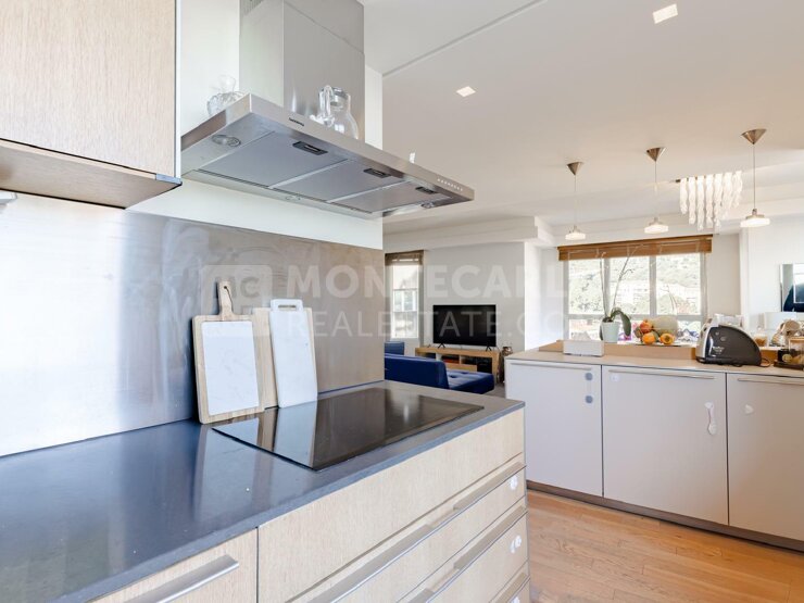 Sulle alture di Monaco, nella zona residenziale del giardino esotico, questo attico duplex offre una vista panoramica sul mare, sulla roccia e sulla costa italiana.
