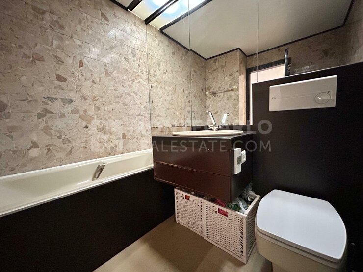 L'appartamento si compone di un ingresso, una sala da bagno, una piccola cucina separata, un soggiorno luminoso e un secondo spazio living, ottenuto grazie alla chiusura autorizzata della loggia con una vetrata.