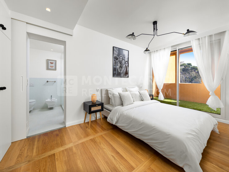 Situé en étage élevé au-dessus du paisible port de Fontvieille, cet appartement entièrement rénové et élégamment meublé offre un mélange rare de confort, de style et de superbes vues sur le port et le Rocher historique de Monaco.