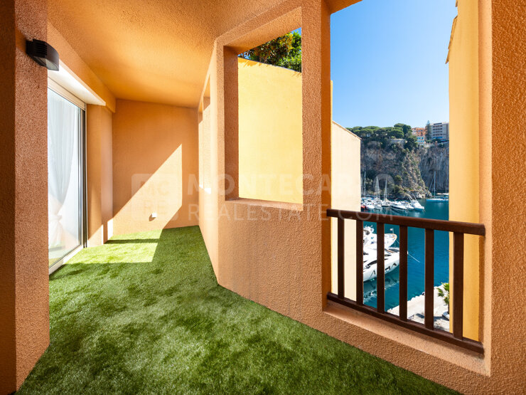 Appartement récemment rénové et entièrement meublé, avec vue sur le port de Fontvieille et Le Rocher. Loué 7 500 euros par mois (charges comprises), le bien offre un rendement net attractif de 2,75 % (hors charges).