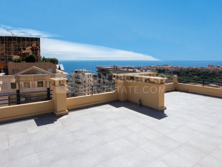 This vast penthouse of an elegant period building in the Jardin Exotique district has been completely renovated. It benefits from a large roof terrace for private use and exclusive offering panoramic views of the sea, Monaco and the Prince's Palace.