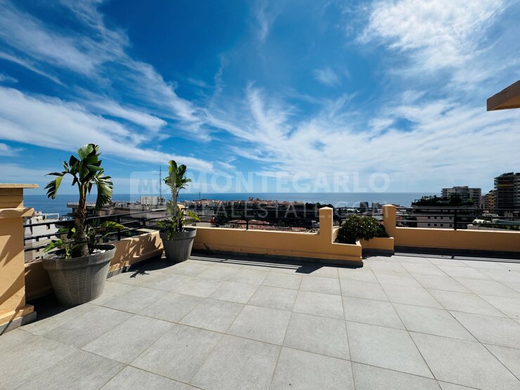 Il offre de superbes volumes baignés de lumière ainsi qu’un toit-terrasse privatif avec une vue panoramique exceptionnelle sur la mer, les montagnes et le Palais Princier.