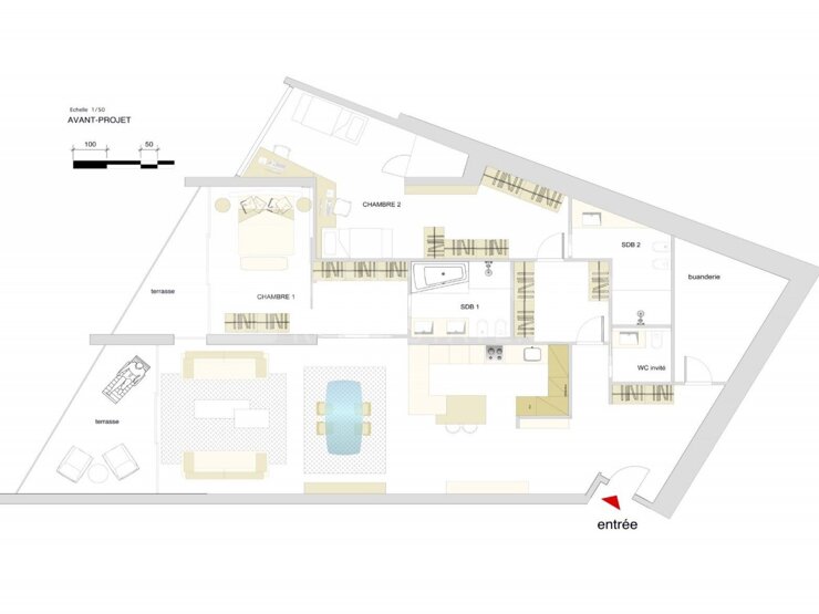 3 stanze, nel Carré d'Or, in una residenza di lusso. Superficie totale di circa 192 mq di cui 152 mq di superficie abitabile e 40 mq di terrazzo. L'appartamento è composto da un ingresso, un doppio soggiorno-pranzo, una cucina separata ed attrezzata, due camere da letto, un bagno, un bagno con doccia e WC, armadi e due logge. L'appartamento è ristrutturabile secondo il progetto preliminare proposto. Una cantina e parcheggio.