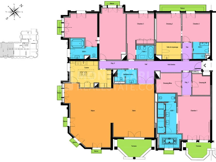 In una residenza di lusso, situata in posizione ideale nel Carré d'Or, splendido appartamento di 6/7 vani, di altissimo livello, con vista mare. La superficie totale è di 414,70 m², di cui 380 m² abitabili e 34,70 m² di terrazza. Contratto di locazione di 2 anni rinnovabile. Affitto mensile 115.000 € + acconti su spese 7.500 €. 5 parcheggi, incluso un box da 3 posti, e 1 cantina/locale sicuro. Servizi di lusso con portineria.