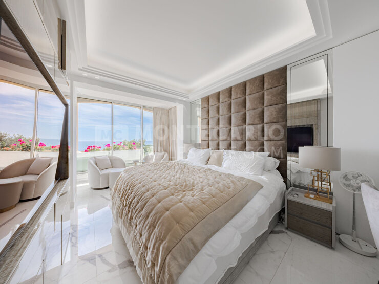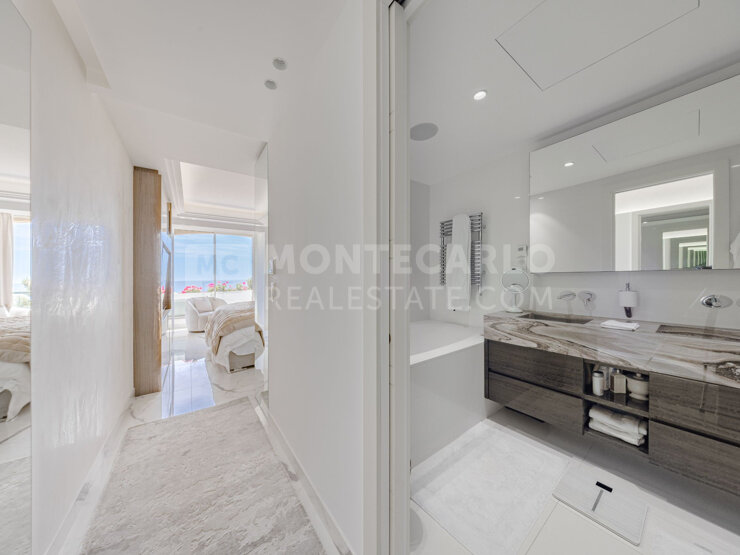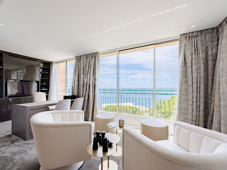 Lussuoso appartamento di 4 locali completamente ristrutturato, che unisce materiali di pregio e modernità, con una vista mozzafiato sul Mar Mediterraneo e sui giardini rigogliosi. Questo appartamento, inondato di luce naturale, offre ampi spazi, doppi vetri tripli dal pavimento al soffitto e terrazze disposte in modo armonioso. Dispone di un soggiorno con zona pranzo e un angolo bar elegante; la grande cucina su misura è dotata di elettrodomestici professionali, mentre ogni camera gode di una meravigliosa vista sul mare e del proprio bagno privato. Un sistema di aria condizionata indipendente e un riscaldamento a pavimento garantiscono il massimo comfort durante tutto l'anno. I residenti hanno accesso a un servizio di portineria, a una piscina privata e a una posizione eccellente vicino al porto. L'immobile include due posti auto sotterranei.