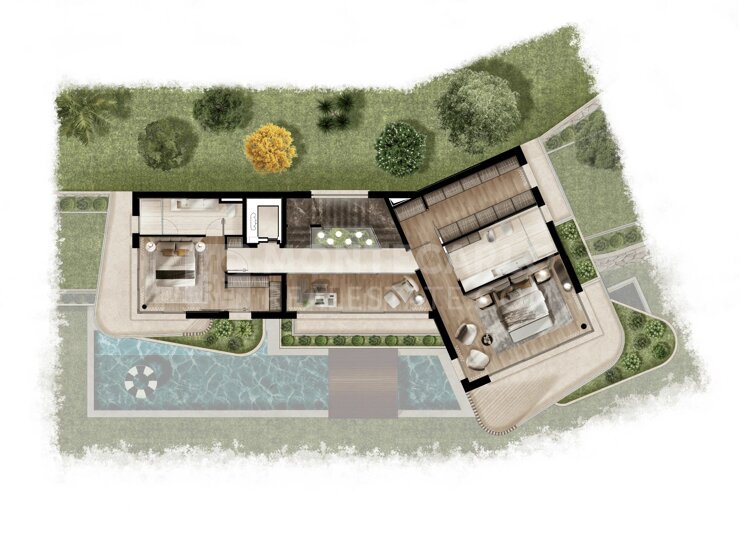 Le projet prévoit : • Un vaste espace de vie avec séjour, salle à manger et cuisine ouverte • 6 chambres, dont 2 suites, toutes avec salles de bains/douches et dressings • Nombreuses terrasses végétalisées prolongeant les espaces de vie • Piscine • Garage exceptionnel de 236 m².