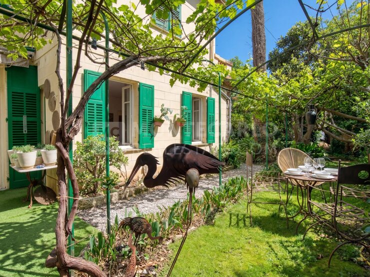 À l’extérieur, le jardin clos, ponctué d’agrumes et de végétation luxuriante, offre une atmosphère douce et confidentielle, rare en cœur de ville. Plusieurs espaces de stationnement extérieurs viennent compléter la propriété.