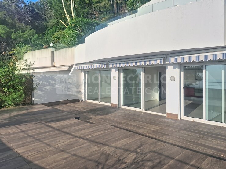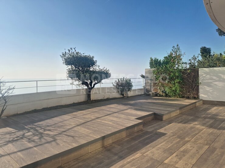 Vue mer panoramique et terrasse exceptionnelle de 60 m² pour ce 2 pièces aménagé en 3 pièces, situé dans une résidence sécurisée avec piscine et stationnement.