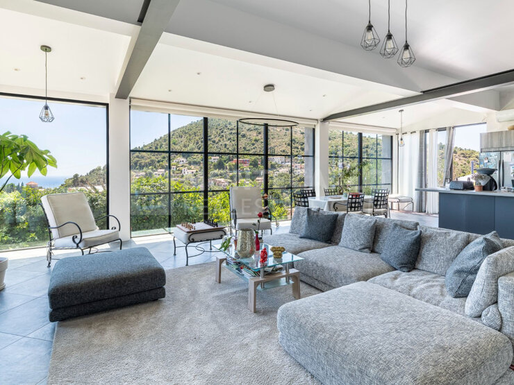 Magnifique villa individuelle de 150 m² située dans le quartier recherché Proche Village de La Turbie. Nichée sur un terrain généreux de 1245 m², la propriété dispose d'une vue imprenable sur la mer et la montagne avec une orientation sud sud-ouest. Répartie sur deux niveaux, elle propose trois chambres, une salle de douche, deux toilettes, deux terrasses, deux parkings et une cave. Dans un état intérieur excellent, elle bénéficie d'une cuisine américaine équipée, d'un système d'eau chaude électrique et de climatisation réversible. Parmi ses prestations, vous profiterez d'une piscine chauffée, d'un pool house, d'une cheminée et deux chambres de plain-pied. Elle offre également un double vitrage, un arrosage automatique, une buanderie, un portail automatique et un environnement calme.