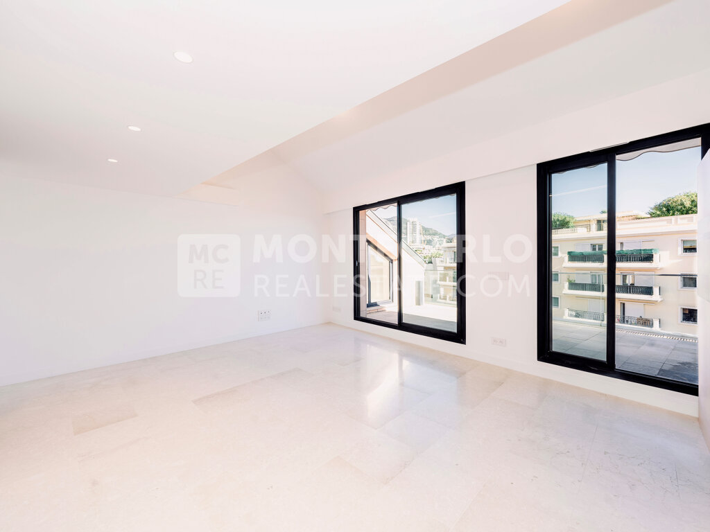 Elégant penthouse rénové avec vue dégagée et rentabilité, double exposition, 2/3 chambres, 2 parkings et 1 cave au coeur de La Condamine