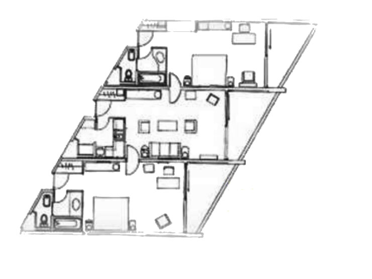2 chambres en suite, un séjour, 1 cuisine séparée. Chaque pièce bénéficie de sa loggia en accès privatif vue mer.