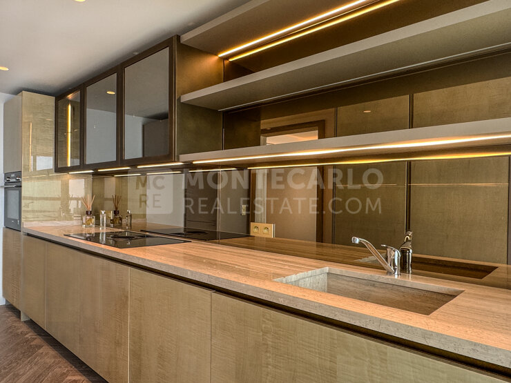 В престижной резиденции Monte Carlo Sun вас ожидает стильно отреставрированная и элегантно оформленная четырёхкомнатная квартира, соответствующая самым высоким требованиям к качеству жизни. Она сочетает в себе вечную утончённость и современный комфорт на высочайшем уровне. Просторная гостиная, совмещённая с обеденной зоной, выполнена в открытой планировке и впечатляет панорамными окнами во всю высоту, создающими необычайно светлую и уютную атмосферу. Элегантные раздвижные стеклянные двери ведут на частную террасу, обеспечивая плавный переход между внутренним и внешним пространством. Юго-восточная ориентация открывает непревзойдённый, свободный панорамный вид на Средиземное море. Кухня высокого класса покоряет изысканным дизайном и первоклассной техникой — идеальный выбор для требовательных гурманов. Спальни просторные и со вкусом оформлены. Большие встроенные шкафы, выполненные на заказ, обеспечивают достаточно места для хранения. Ванные комнаты при спальнях отделаны благородным мрамором и завершают образ этой роскошной недвижимости. Резиденция Monte Carlo Sun предлагает своим жильцам первоклассный круглосуточный консьерж-сервис и ухоженный открытый бассейн — идеальное место для отдыха под солнцем Лазурного Берега. В непосредственной близости находятся престижный кантри-клуб, теннисный клуб и пляжи, до которых можно дойти пешком за несколько минут. В предложение также входят просторная кладовая и частное парковочное место в подземном гараже резиденции.