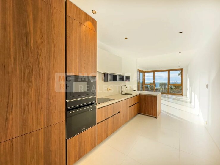 Трехкомнатная квартира состоит из прихожей, ведущей в гостиную-столовую с кухней открытого плана, просторной главной спальни с гардеробной и ванной комнатой, второй спальни с собственной душевой, кладовой, гостевого туалета и гардеробной, террасы.
