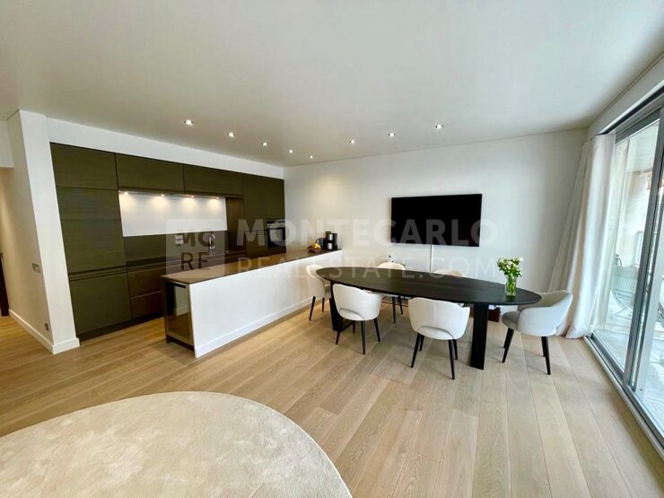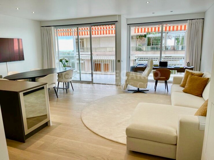Le salon et la salle à manger bénéficient d'un accès direct à la terrasse avec une jolie vue mer.