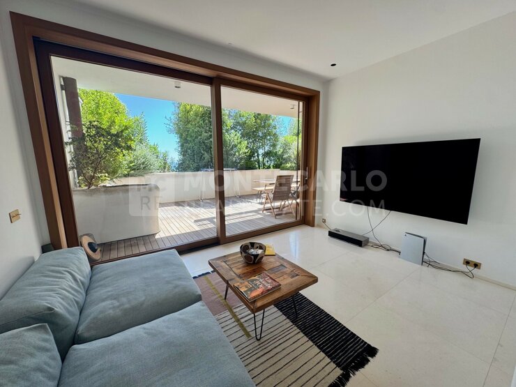 Terrasse de 35 m² offrant une vue imprenable sur la mer et sur le Rocher, exposition sud.
