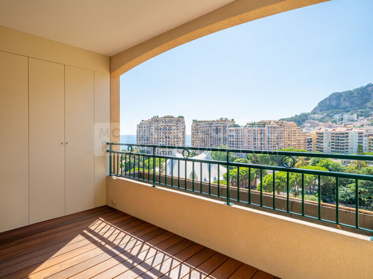 Appartement 2 pièces en étage élevé sur le port de Fontvieille, avec loggias offrant une vue dégagée sur la Roseraie Princesse Grace. Résidence avec concierge et piscine. Parking et cave inclus.