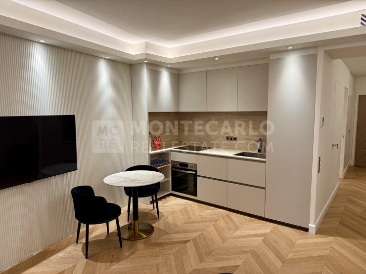 L’appartement offre des prestations haut de gamme et se compose d’une entrée avec couloir, d’une chambre (avec salle de bain en suite équipée d’une douche, WC et bidet), d’un WC invités avec douche, ainsi que d’un séjour avec cuisine américaine entièrement équipée. L’ensemble est neuf.