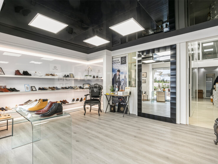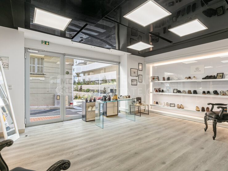 Ce local commercial à usage mixte bénéficie d'une excellente visibilité grâce à ses deux grandes vitrines sur rue. Actuellement configuré en showroom de prestige, l'espace se compose de deux locaux connectés l'un à l'autre au rez-de-chaussée.