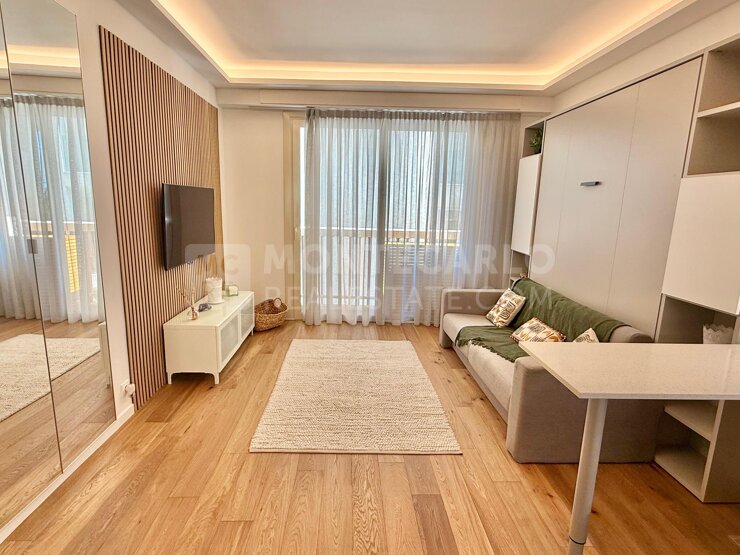Sur le boulevard de Belgique, studio meublé, au calme, d'environ 30 m² entièrement rénové dont un petit balcon de 1.50 m². Pièce principale avec grande baie vitrée, lit escamotable, canapé, cuisine américaine toute équipée de neuf avec lave-vaisse...